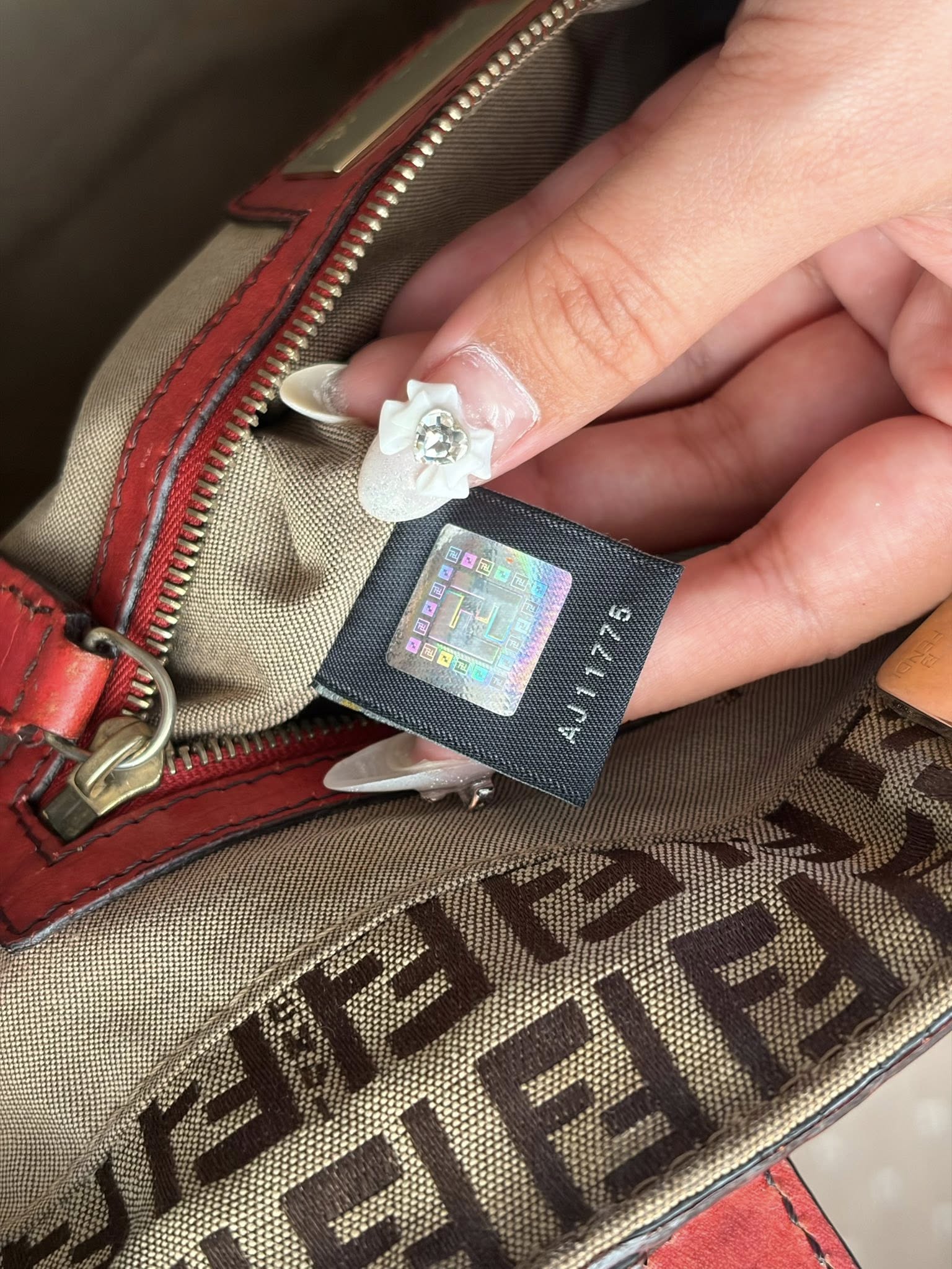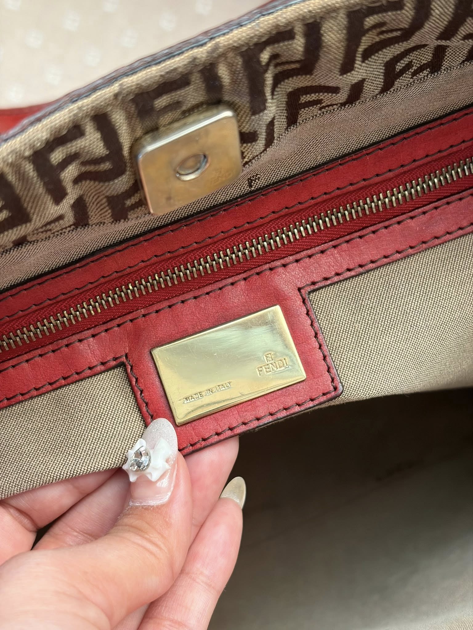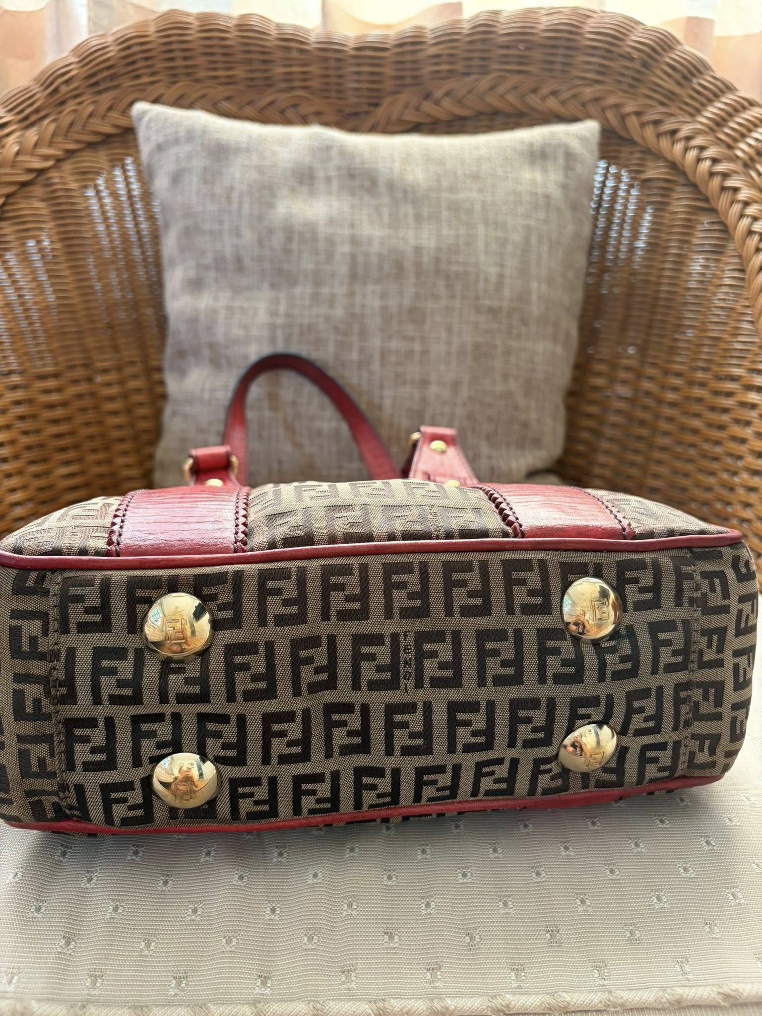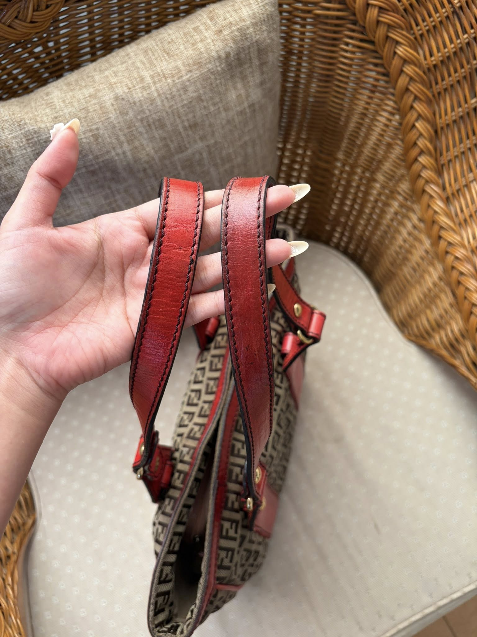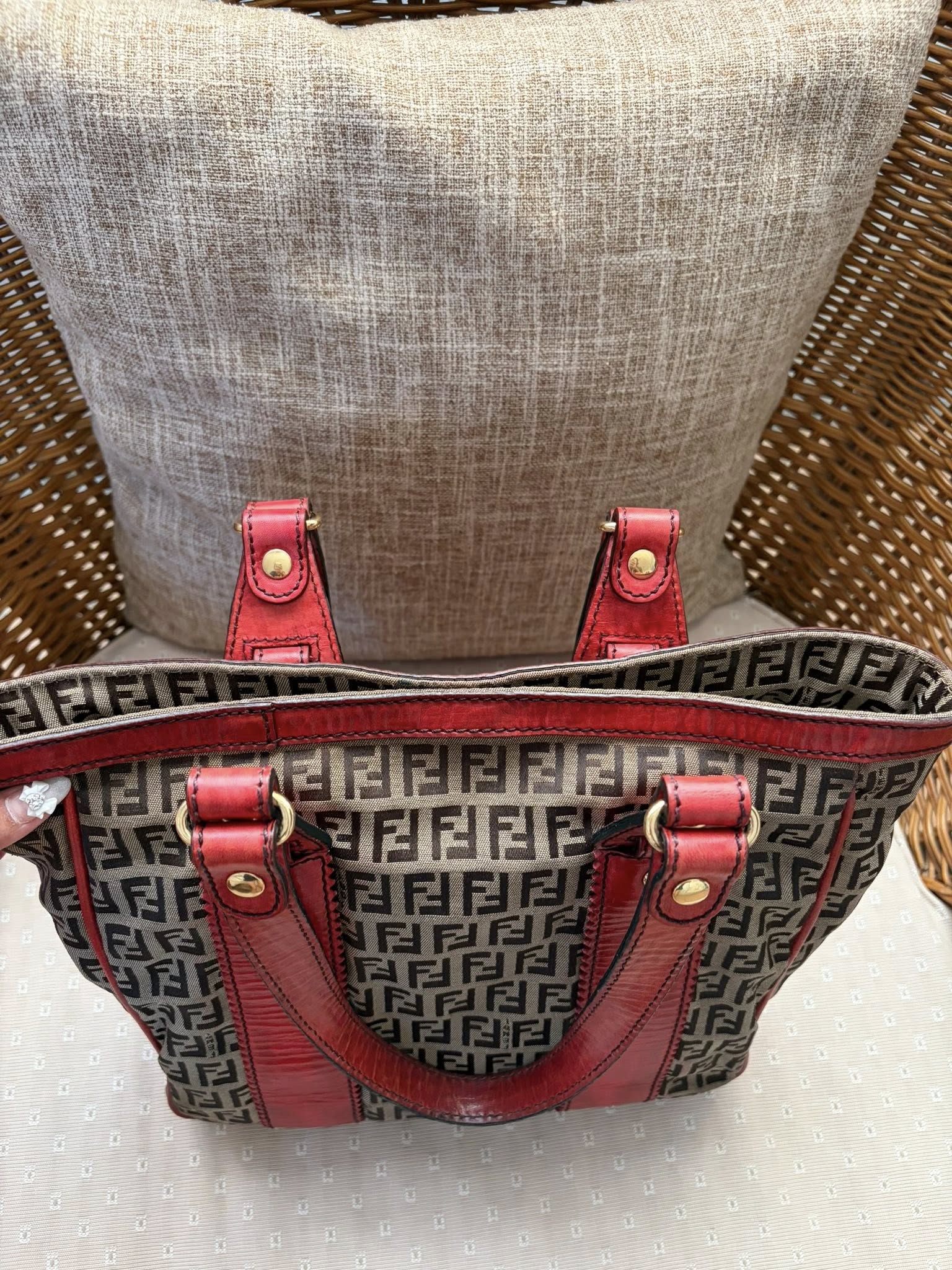Fendi tote ขนาด 9.5×11 นิ้ว หูยาวสะพายไหล่ได้ หนังมีคล้ำขึ้นบางจุด ผ้าไม่มีขาดรันเลย อะไหล่ยังทอง